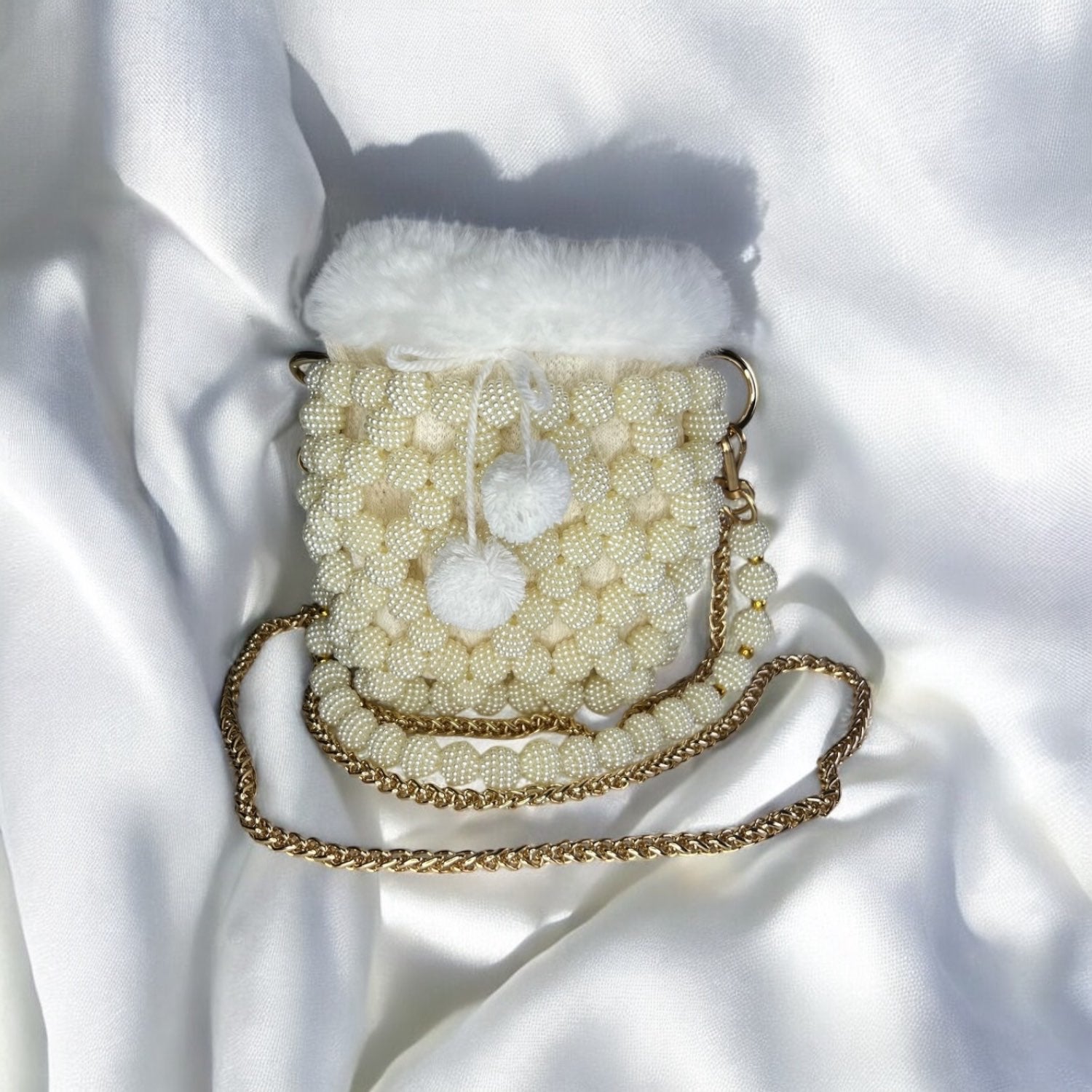 A winter dream in beads: This handcrafted bag features a fluffy faux fur trim, making it perfect for the colder season or elegant events. The soft pom-poms add a playful yet luxurious touch to the design.